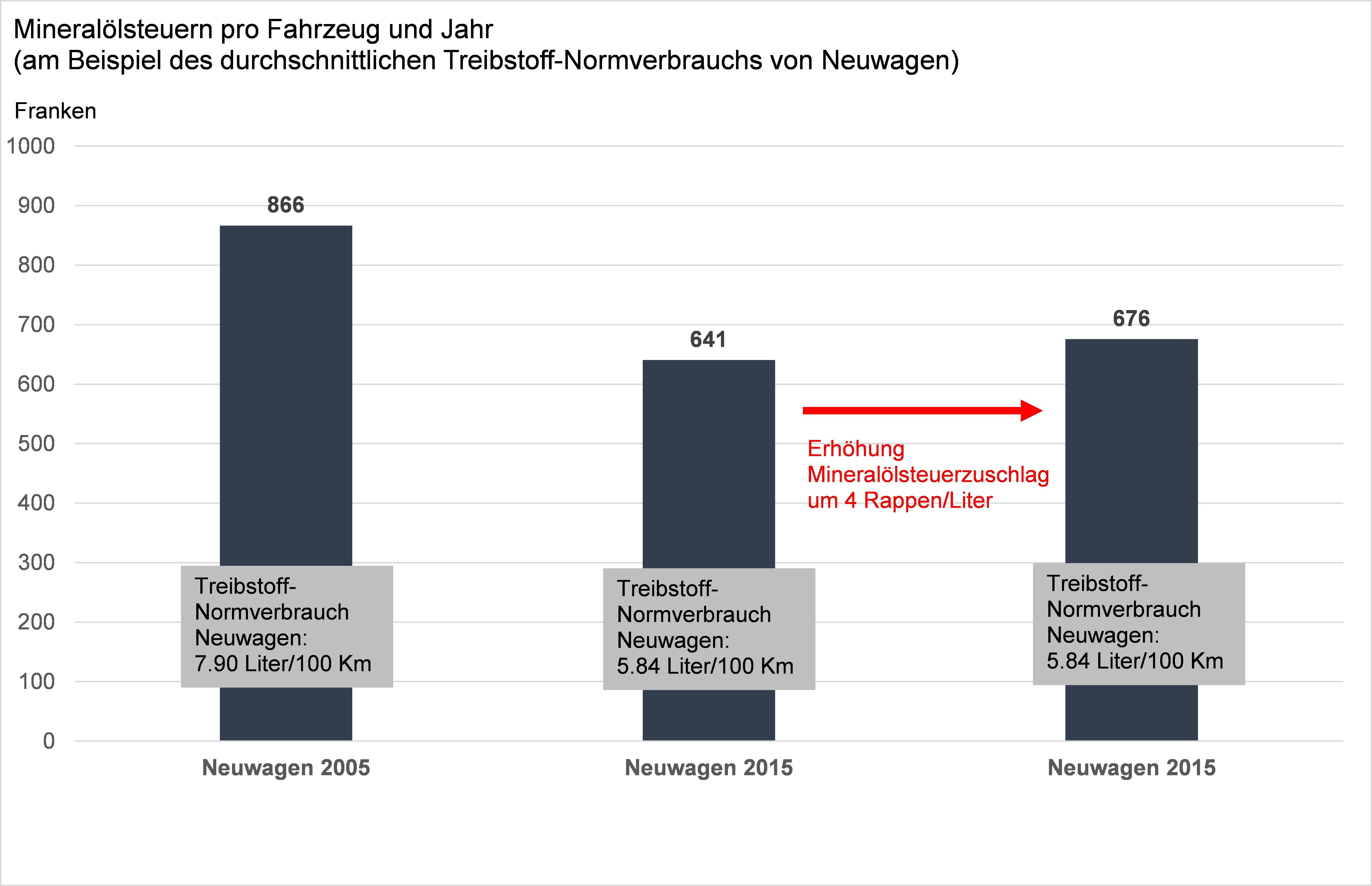 Die Erhöhung um 4 Rappen ist deshalb moderat und verkraftbar. Sie erfolgt im Übrigen erst, wenn sie tatsächlich nötig ist: Es wird kein Geld auf Vorrat erhoben. Die Erhöhung kommt erst im Jahr, bevor der Bestand im NAF unter die kritische Grenze von 500 Millionen Franken fällt. Der Bundesrat geht davon aus, dass die Erhöhung des Mineralölsteuerzuschlags frühestens 2019 fällig wird.