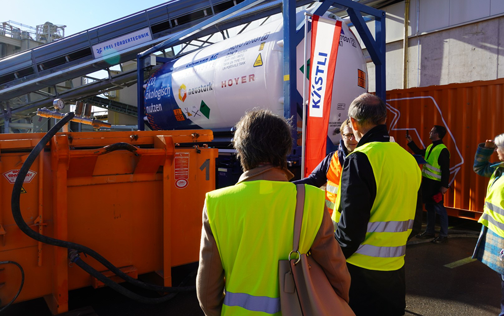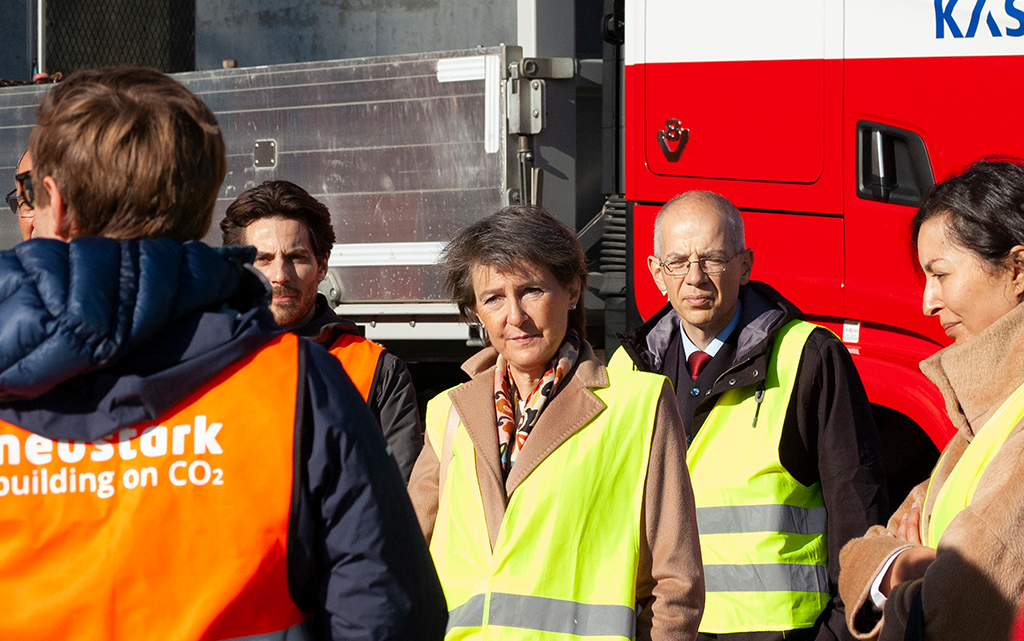 Bundesrätin Simonetta Sommaruga hat sich gemeinsam mit Fachleuten und Vertretern der UREK eine neuartige Technologie demonstrieren lassen. Das Berner Unternehmen Neustark, ein Spin-Off der ETH, entfernt CO2 aus der Atmosphäre. Das Material wird dann in die Produktion für frischen Beton eingespeist. Das Verfahren soll künftig bei Betonrecyclingwerken zum Einsatz kommen. Die Zementmenge im Beton kann so reduziert werden. Die traditionelle Zementproduktion ist Mitverursacherin der hohen CO2-Emissionen.