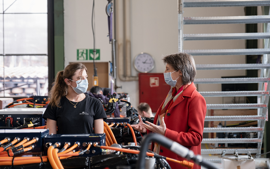 Das 2009 in Winterthur gegründete Unternehmen produziert Elektro-Lastwagen, die zum Beispiel für die Kehrrichtabfuhr im Einsatz sind, sowie Schnellladegeräte für grosse Kunden. Heute beschäftigt es rund 100 Mitarbeitende. Bundesrätin Sommaruga hat das Unternehmen am 26. Februar 2021 besucht. «Von den Investitionen in den Klimaschutz profitieren Bevölkerung und Wirtschaft. Elektro-Lastwagen senken den CO2-Ausstoss. Und durch klimafreundliche Technologien entstehen Arbeitsplätze mit Zukunft», sagte sie nach dem Rundgang. Es lohne sich daher, beim Klimaschutz vorwärts zu machen. Genau das sei das Ziel des CO2-Gesetzes, über das im Juni abgestimmt werde. «Wir müssen jetzt die Weichen richtig stellen!»
