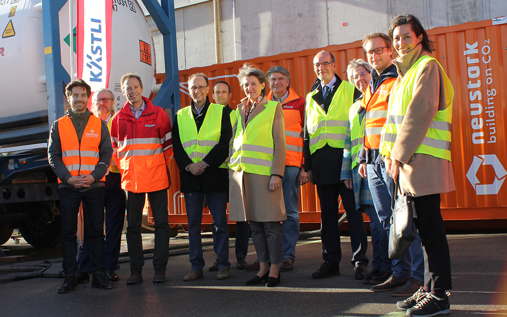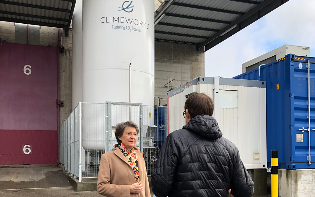Bundesrätin Simonetta Sommaruga besichtigte am 8. November 2021 in Hinwil die CO2-Filter-Anlage von Climeworks bei der Kehrichtverwertungsanlage des Zweckverbands Zürcher Oberland (KEZO). Dort wird CO2 der Umgebungsluft entzogen (Direct Air Capture). Auf diese Weise gewonnenes CO2 kann industriell weiterverwertet oder dauerhaft im Boden gespeichert werden. Mit Wasserstoff kombiniert kann es auch zur Herstellung synthetischer, klimaneutraler Treibstoffe kombiniert werden.