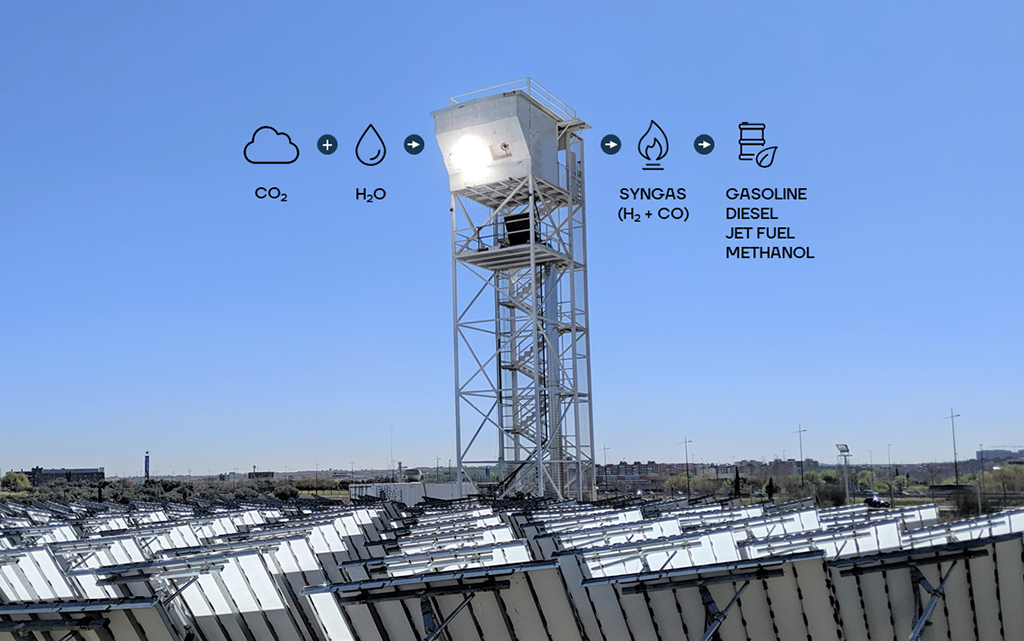 Neben Vertretern von Climeworks waren auch Vertreterinnen und Vertreter von Synhelion beim Besuch mit dabei. Diese Firma hat eine Technologie entwickelt, mit der aus Sonnenlicht und Luft klimafreundlicher Treibstoff hergestellt werden kann. Das Produkt ist Syngas, eine Mischung aus Wasserstoff und Kohlenmonoxid, das anschliessend z.B. zu Kerosin verflüssigt werden kann. Mit dem solaren Treibstoff können Flugzeuge betankt werden.