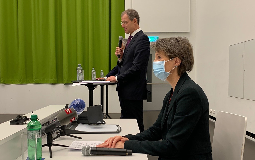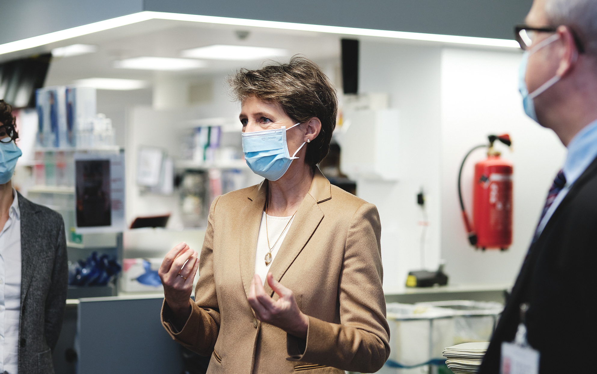 Die wachsende Zahl von Personen, die in der Schweiz infolge einer COVID-19-Erkrankung hospitalisiert werden, ist beunruhigend. Am Samstag, dem 24. Oktober 2020, besuchte Bundespräsidentin Simonetta Sommaruga das Inselspital in Bern, um mit den Verantwortlichen, der Ärzteschaft und den Pflegenden die Lage zu erörtern. Bei ihrem Rundgang besichtigte sie das Testzentrum «Covid Track», das universitäre Notfallzentrum und die Intensivstation. Begleitet wurde sie bei ihrem Besuch vom Berner Regierungspräsidenten und Gesundheitsdirektor Pierre-Alain Schnegg.