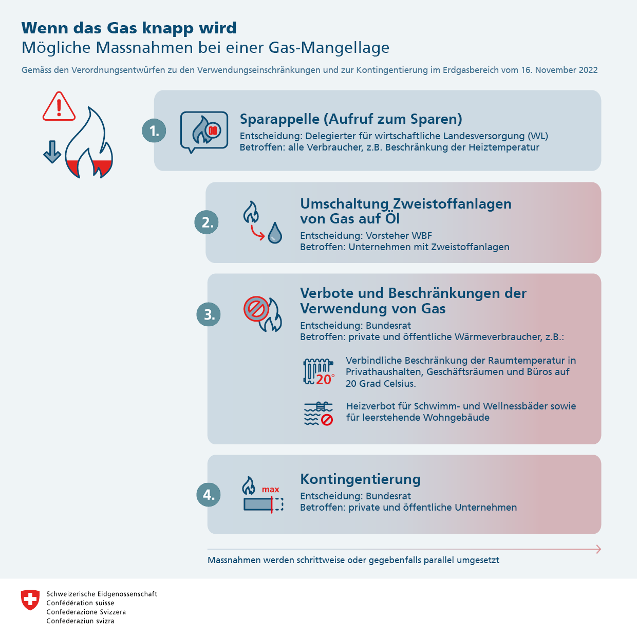 Der Bundesrat hat am 24. August 2022 für das Winterhalbjahr (Anfang Oktober 2022 bis Ende März 2023) beim Gas ein freiwilliges Sparziel von 15% beschlossen. Die Schweiz ist beim Gas vollständig von Importen aus dem Ausland abhängig. Eine europäische Mangellage würde sich daher direkt auf die Schweiz auswirken und den Abruf der von der Schweiz im Ausland eingekauften Gaslieferungen erschweren. Die Schweiz soll darum wie andere Länder mit freiwilligen Massnahmen dazu beitragen, eine Mangellage zu verhindern. Die EU-Staaten haben sich zum Ziel gesetzt, von August 2022 bis März 2023 gemeinsam 15% weniger Gas zu verbrauchen.