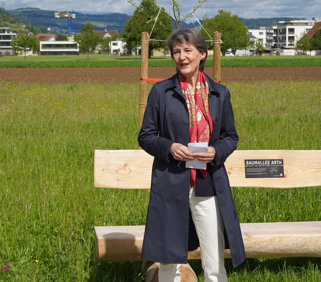 Am 22. Mai 2021, dem Internationalen Tag der Biodiversität, eröffnete Bundesrätin Simonetta Sommaruga eine Baumallee in Arth (SZ). Über 150 Hochstammbäume werten die Landschaft auf und tragen zur Artenvielfalt bei.