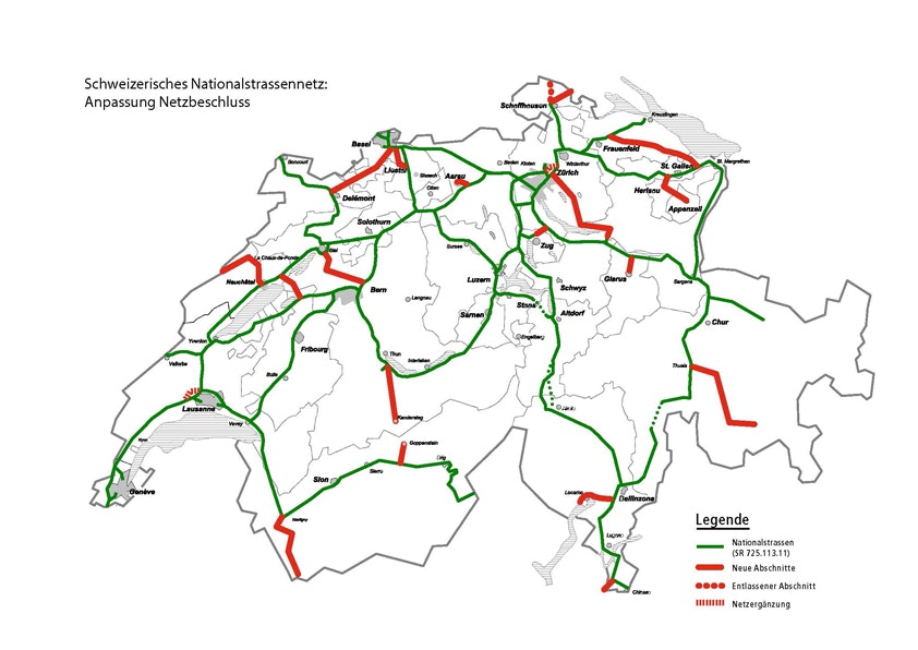 Um mittelgrosse Städte und Agglomerationen sowie Berg- und Randregionen verkehrsmässig gut anzubinden, haben Bundesrat und Parlament mit dem Netzbeschluss entschieden, auf Anfang 2014 rund 383 Kilometer bestehende kantonale Strecken neu ins Nationalstrassennetz aufzunehmen. Mit dem Netzbeschluss kann zudem die Planung an den beiden Netzergänzungen in Morges / Lausanne sowie im Zürcher Glatttal fortgesetzt werden. Damit können gravierende Engpässe beseitigt werden. Der Netzbeschluss schafft zudem die Basis zur Finanzierung verschiedener Umfahrungen. Dies entlastet die Bevölkerung von Verkehr und Lärm.