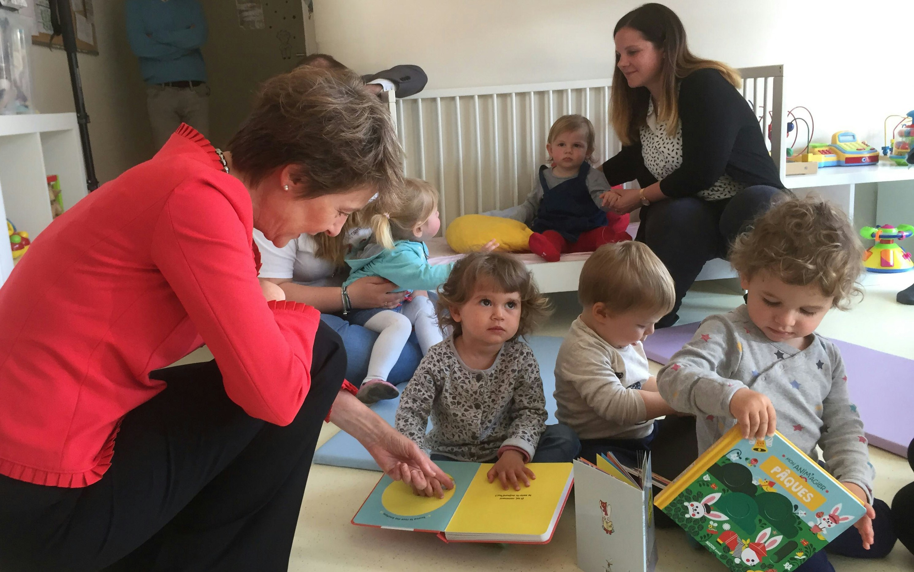 Nach einem Rundgang durch die Krippe sprach Bundesrätin Sommaruga mit den Mitarbeitenden über ihre Aus- und Weiterbildung, die Arbeitsbedingungen und ihre Entlöhnung. Beim Gespräch ging es zudem um die Bedeutung, welche die Kinderkrippen für viele Eltern haben, um Beruf und Familie besser miteinander vereinbaren zu können.