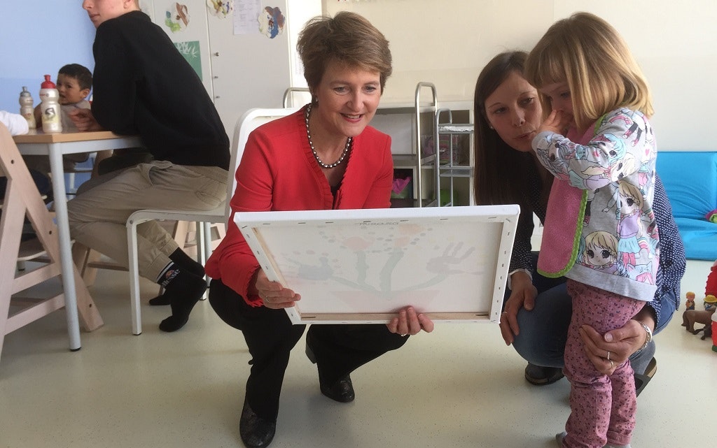 Bundesrätin Simonetta Sommaruga besuchte am 1. Mai 2019 die Kinderkrippe «L’arche des enfants / D’Chinderarche» in Fribourg, um Einblick zu erhalten in den Alltag und die Arbeitsbedingungen der Betreuerinnen und Betreuer. Politik und Gesellschaft seien in der Pflicht, für gute Arbeitsbedingungen und eine gerechte Entlöhnung der Mitarbeitenden zu sorgen, betonte Bundesrätin Sommaruga anlässlich des Besuchs in der Kinderkrippe.