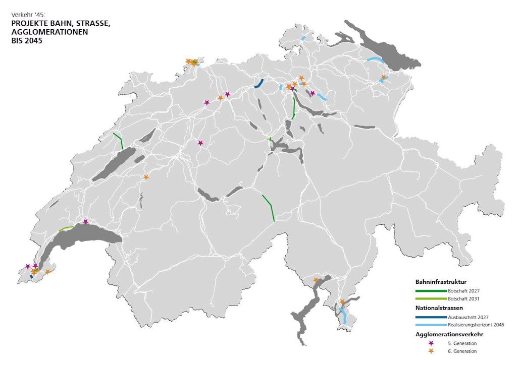 - Der Bundesrat will festlegen, welche Projekte in den Bereichen Schienen-, Strassen- und Agglomerationsverkehr bis 2045 prioritär verwirklicht werden sollen.