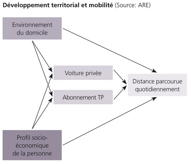 Il existe un lien étroit entre les caractéristiques spatiales de la commune de domicile et la mobilité des habitants. Un habitat dense et la présence de services et de commerces à proximité contribuent par exemple à freiner la croissance des transports. La distance parcourue quotidiennement par personne et par jour, indicateur essentiel du volume de trafic, est plus petite
