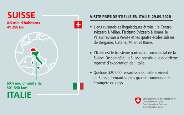 La présidente de la Confédération Simonetta Sommaruga a rencontré le président de la République italienne, Sergio Mattarella, et le chef du gouvernement, Giuseppe Conte, mardi 29 septembre 2020 à Rome. Les deux parties se sont félicitées de la qualité de leur collaboration pendant la crise du coronavirus. Elles ont signalé leur volonté de signer l’accord sur l’imposition des frontaliers d’ici la fin de l’année. Les échanges ont porté sur la protection de l’environnement et du climat, mais aussi sur les investissements nécessaires à la relance économique.
