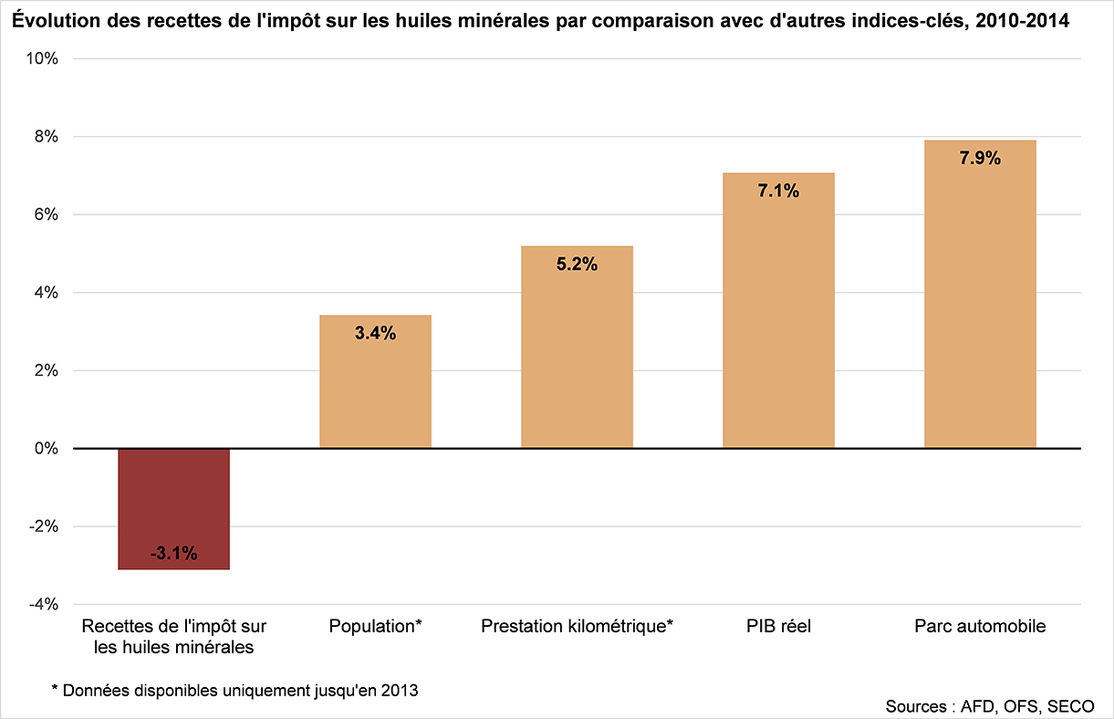 Les produits provenant de l'impôt sur les huiles minérales sont donc en baisse malgré une augmentation de la population et de la mobilité. Depuis 2010, les produits de l'impôt sur les carburants ont diminué de 159 millions de francs, soit un recul de 3,1 %. Dans la même période, le produit intérieur brut réel et le nombre de véhicules en Suisse ont progressé de plus de 7 %. Jusqu'à 2013, la population a augmenté de 3,4 % et les distances parcourues de 5,2 %. Cette baisse des produits provenant de l'impôt sur les huiles minérales dans un contexte de croissance démographique s'explique par l'amélioration de l'efficacité énergétique des véhicules ainsi que par la diminution du tourisme à la pompe.