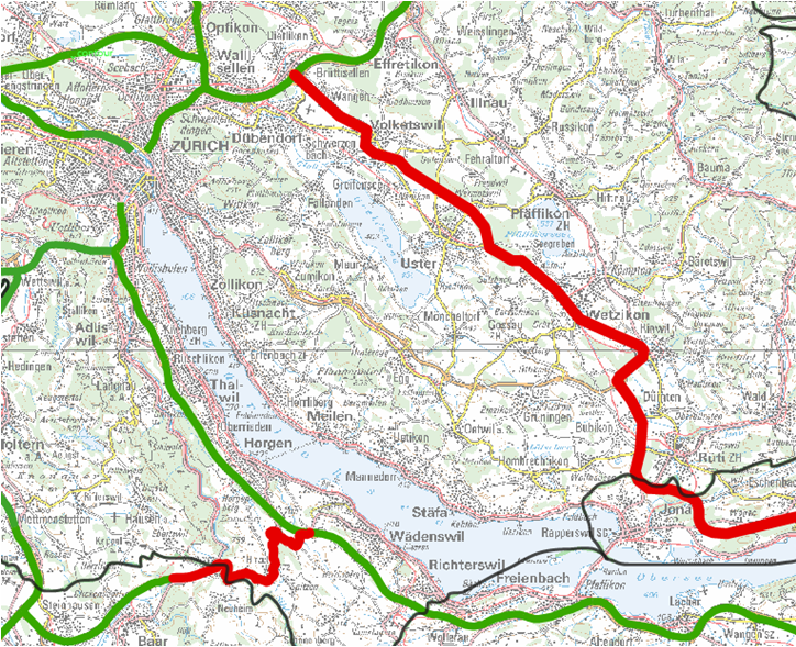- Kantonsgrenze ZG - Hirzel - Wädenswil des Abschnitts Baar - Hirzel - Wädenswil mit 8,3 Kilometern Länge. Die Aufnahme des Abschnitts in den Netzbeschluss schliesst eine bestehende Lücke zur besseren Anbindung von Luzern/Zug an die Region Rheintal/Vorarlberg. Ausserdem bietet die Strecke eine Netzredundanz zur Umfahrung von Zürich West, was das Verkehrsmanagement erheblich erleichtert.