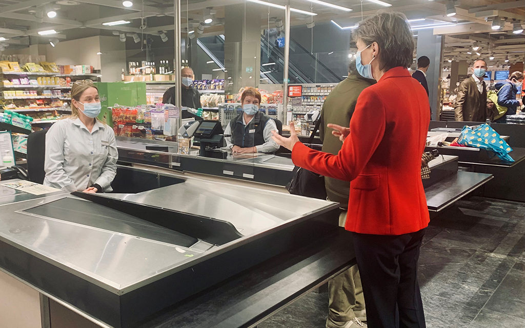 Simonetta Sommaruga ha in seguito discusso con alcune venditrici di un grande magazzino svizzero. La pandemia è stata all’origine di grossi cambiamenti nel commercio al dettaglio e il personale ha dovuto adattarsi costantemente alle nuove circostanze. In alcuni casi, ha dovuto far fronte a orari di lavoro più lunghi per soddisfare la forte domanda e, nel contempo, gestire una clientela a volte restìa a rispettare le misure sanitarie.