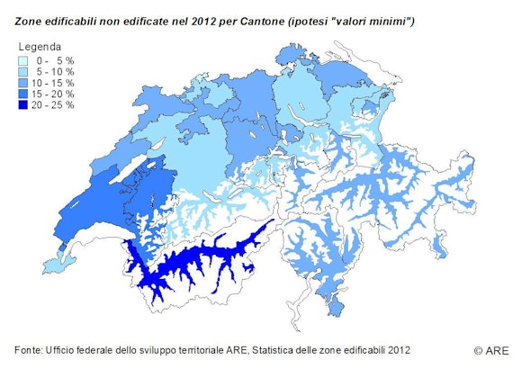 Attualmente in Svizzera le zone edificabili occupano circa 230 000 ettari, di cui quasi un quinto non sono edificati. Tendenzialmente, nelle regioni rurali e turistiche le riserve di terreni edificabili sono maggiori rispetto alle zone urbane, come emerge dalla seguente cartina: