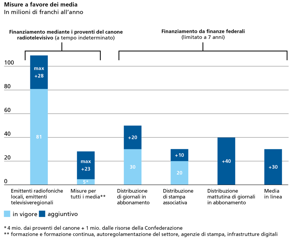 Per il pacchetto di misure è previsto in totale un massimo di 151 milioni di franchi. Il finanziamento è garantito dai proventi dell'attuale canone radiotelevisivo e attraverso il bilancio federale. Non sono previste nuove tasse. Le riduzioni del costo della distribuzione e il sostegno ai media in linea nazionali sono inoltre limitati nel tempo e decadono dopo sette anni.