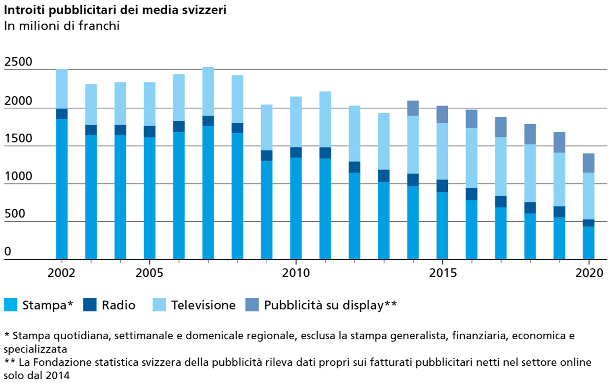 I media versano in difficoltà finanziarie: gli introiti della pubblicità confluiscono in misura sempre maggiore nelle casse di grandi piattaforme Internet internazionali. Molti giornali sono scomparsi. Inoltre, nel contempo, diminuiscono le entrate dovute alla vendita di abbonamenti e la disponibilità a pagare per i contenuti mediatici su Internet è esigua. Anche le stazioni radiofoniche e televisive private perdono entrate pubblicitarie. Ciò va a scapito dell'informazione regionale e locale.
