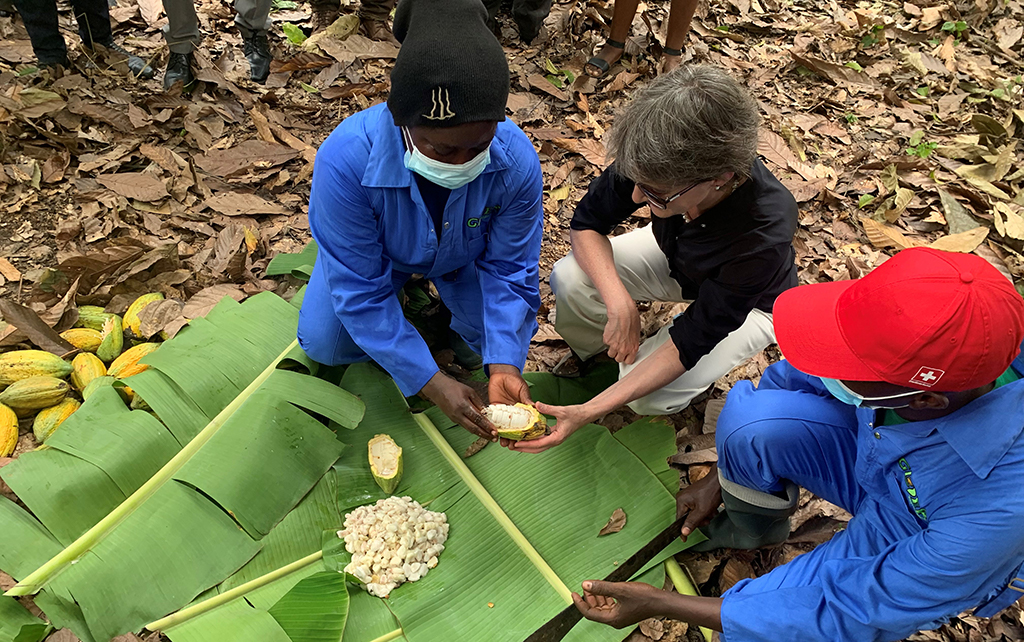 Il Ghana, con i suoi 800 000 piccoli agricoltori, è il secondo produttore di cacao al mondo. La Svizzera importa il 50 per cento del suo cacao dal Ghana. L'industria del cacao deve affrontare numerose sfide (povertà dei piccoli agricoltori, diminuzione della produzione a causa dei cambiamenti climatici, della deforestazione, della perdita di biodiversità). La SECO ha riconosciuto le sfide del settore del cacao e nel 2017, insieme a 55 stakeholder svizzeri, ha lanciato la Piattaforma svizzera per il cacao sostenibile. Entro il 2025, l'80 per cento del cacao importato dovrà provenire da una produzione socialmente, ecologicamente ed economicamente sostenibile. Ciò contribuirà anche migliorare le condizioni di vita dei coltivatori di cacao e delle loro famiglie. Con il suo impegno, la Svizzera assume il ruolo di leader in questo ambito. Nel 2020, durante la visita di Stato del presidente ghanese Nana Akufo Addo a Berna, l'allora presidente della Confederazione Sommaruga aveva parlato con lui delle sfide della coltivazione del cacao. L'8 luglio 2021, durante la sua visita nel Ghana, la consigliera federale Sommaruga ha scambiato opinioni con gli operatori del settore del cacao ed è stata informata in merito agli approcci innovativi attualmente in atto a favore della sostenibilità.