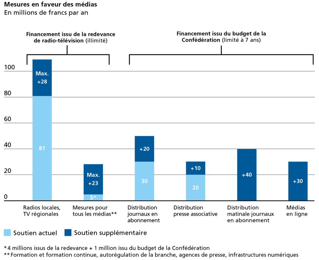L’aide indirecte à la presse s’applique désormais aussi à la distribution matinale, car les abonnés aiment bien lire leur quotidien tôt le matin. En outre, l’aide aux radios privées locales et aux télévisions régionales est augmentée, et une aide aux médias en ligne nationaux vient s’y ajouter. Le train de mesures est conçu de manière à ce que les journaux de petite et moyenne taille ainsi que les médias en ligne bénéficient d’un soutien plus large (dégression). Le but est de renforcer la couverture médiatique dans les régions rurales et les petites villes.