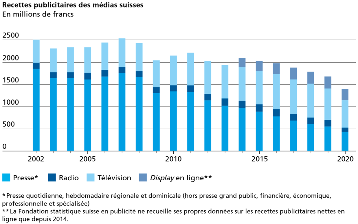 Les médias rencontrent des difficultés financières: une part toujours plus importante des dépenses publicitaires va aux grandes plateformes internet internationales. De nombreux journaux ont disparu. Parallèlement, les journaux voient leurs revenus issus de la vente d’abonnements diminuer. Les utilisateurs restent moins disposés à payer pour des offres numériques. Les radios et télévisions privées voient elles aussi leurs recettes publicitaires diminuer. La couverture médiatique dans les régions s’en trouve affaiblie.