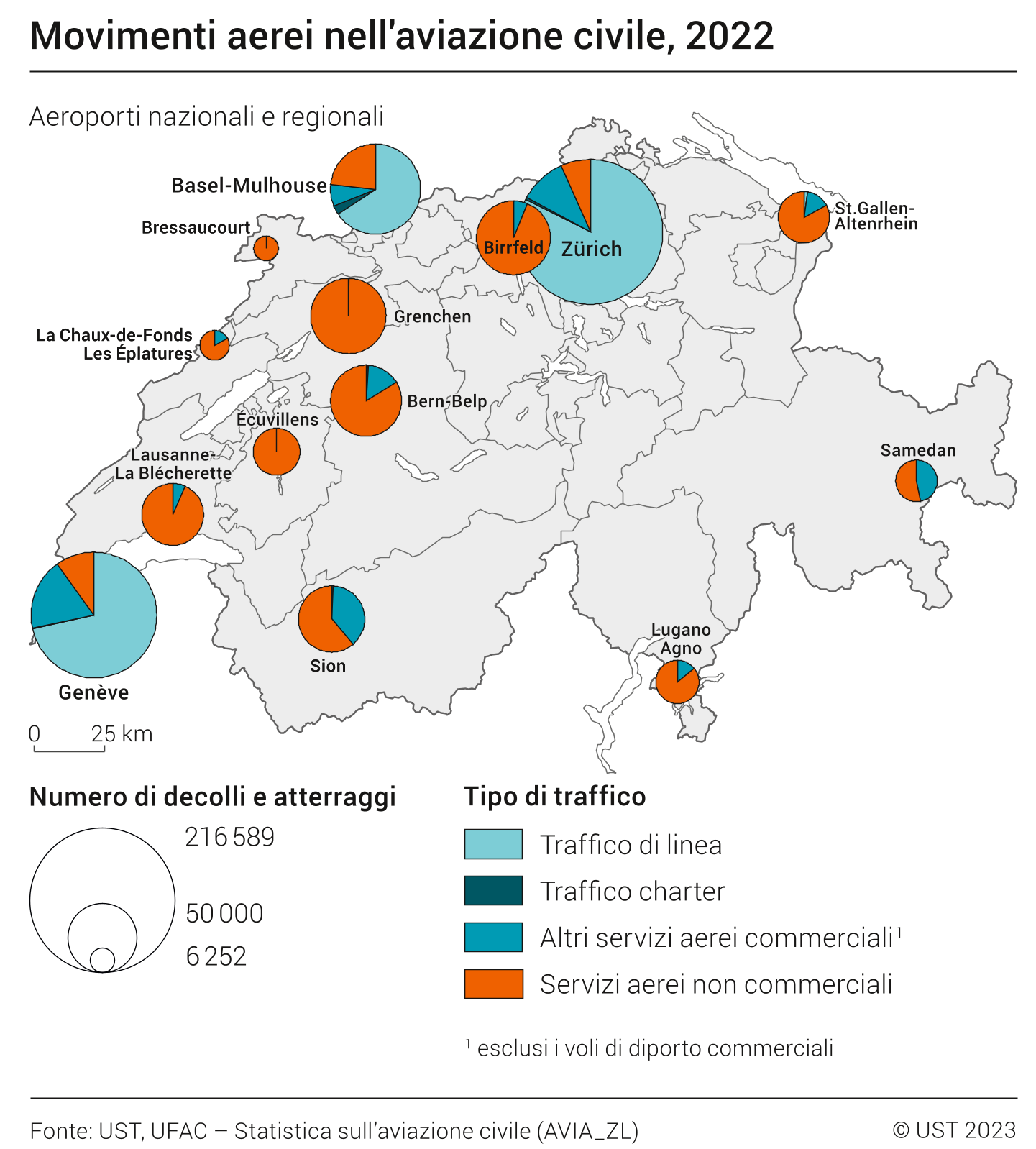 Nel 2022 l’aviazione civile svizzera (traffico di linea e charter e traffico aereo generale) ha registrato complessivamente 1,3 milioni di movimenti di volo (decolli e atterraggi). Oltre ai grandi aeroporti, anche gli aerodromi minori svolgono un ruolo importante, ad esempio nella formazione dei futuri piloti di linea.